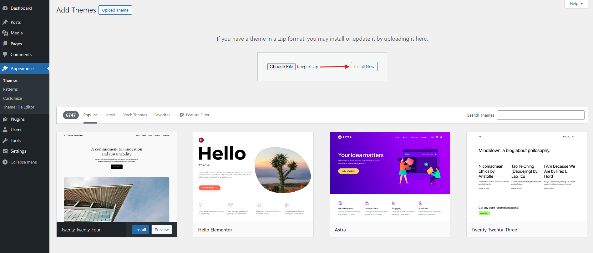 - Navigate to Appearance > Themes and click on Add New and Upload Theme.