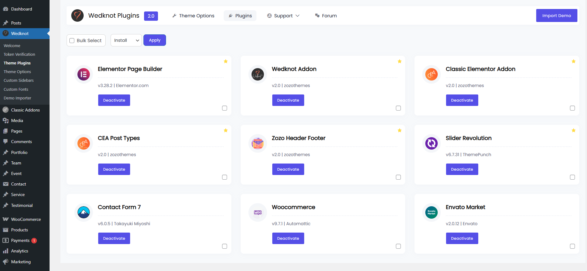 Plugin Installation: Admin Dashboard –>> Wedknot –>> Theme Plugins –>> Install and Activate All required plugins.
