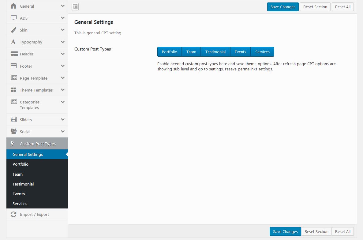 - Custom Post Type: Enable your custom post types and save theme options. After refresh page CPT options are showing sub level and go to settings, resave permalinks settings. (Portfolio, Team, Testimonial, Events, Service are available. These are all in optional).