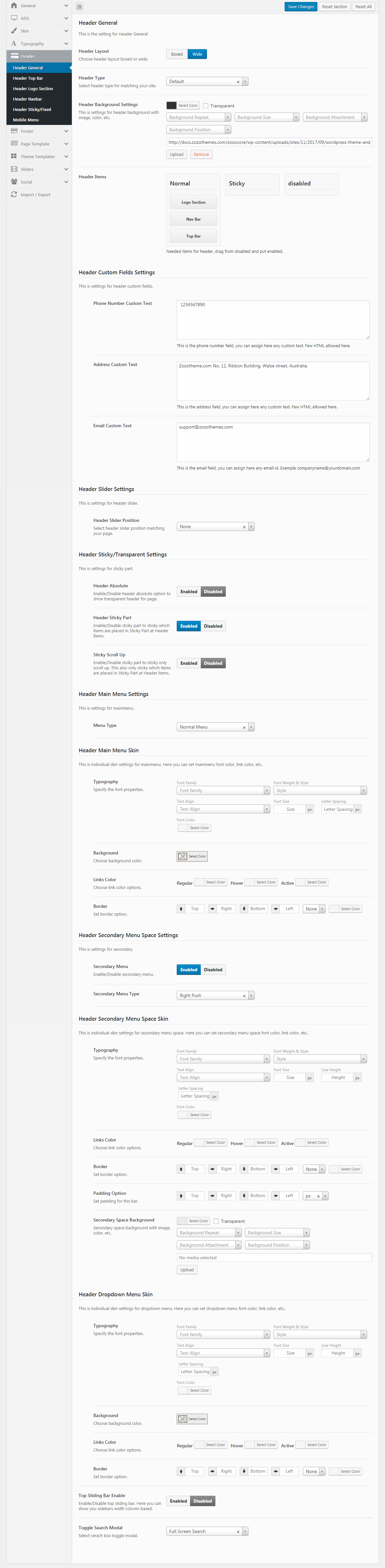 - Header Background Settings: Choose your theme header background color, size, attachment, position ect.