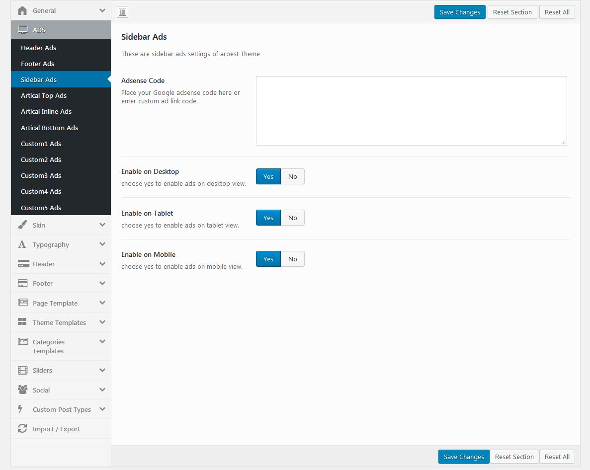 This option is to show the ad’s in the sidebar area. Here you can enter the Google ad code or custom ad link code to display it in header of the theme, and you can enable ads on Desktop, Tablet and Mobile.